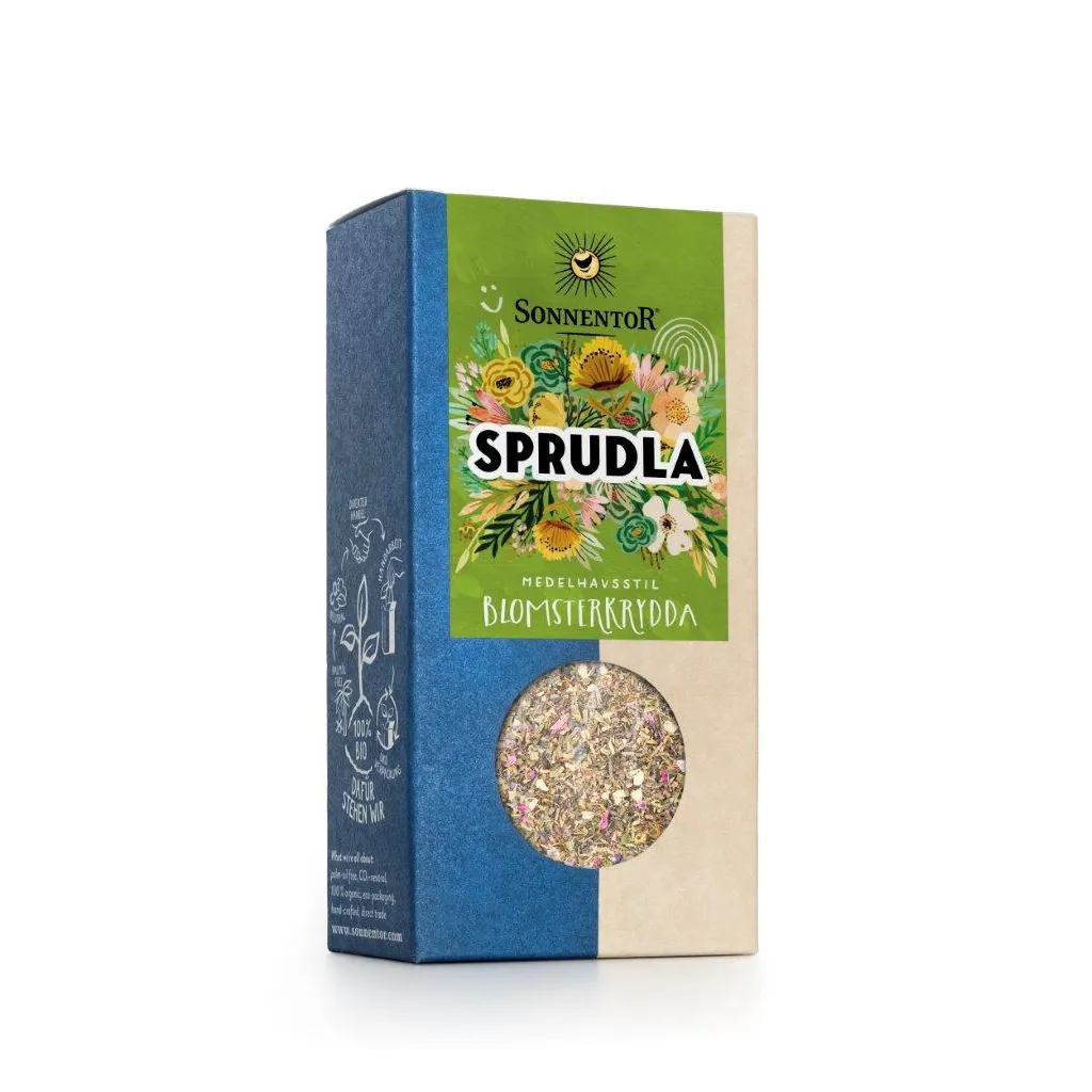 Blomsterkrydda sprudla är en salt, örtig och aromatisk kryddblandning med havssalt och ekologiska örter och blommor. Perfekt i exempelvis dressingar och att toppa sallader och grönsaker med.