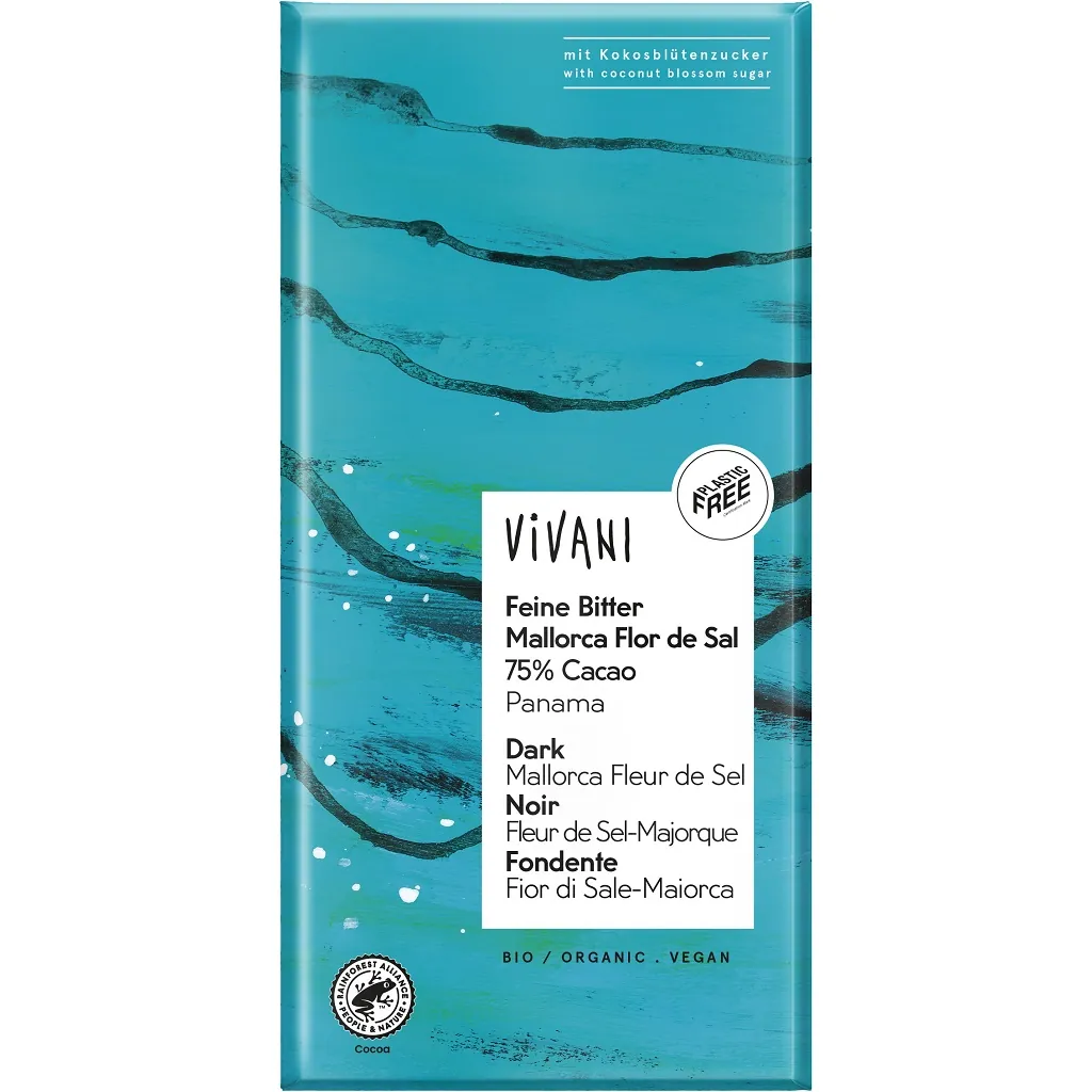 Ekologisk mörk choklad från Vivani med en nypa havssalt från Mallorca. Chokladkakan är vegansk rättvisemärkt, och enbart sötad med kokosblomsocker.