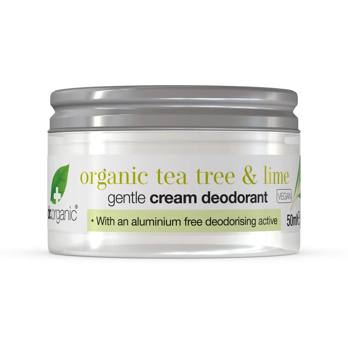 Dr Organics ekologiska deodorant med tea tree och lime är en mild krämdeodorant som ger en frisk doft. Produkten är fri från aluminium.
