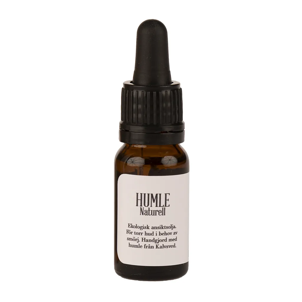 HUMLE Ansiktsolja Naturell är en ekologisk och näringsrik ansiktsolja som vårdar huden och stödjer dess naturliga balans. Berikad med humleolja från egen gård och en blandning av kallpressad jojobaolja, aprikoskärnolja och ricinolja, ger den långvarig återfuktning och en mjuk, sammetslen känsla. Med sitt innehåll av A-, B-, D- och E-vitaminer samt antioxidanter skyddar och stärker oljan huden. Den är särskilt anpassad för normal, torr och fet hy samt hud som upplever utmaningar som acne. Den lätta konsistensen absorberas snabbt och lämnar huden välvårdad utan en oljig känsla. Den praktiska pipetten gör de gyllene dropparna lätta att dosera och applicera. Helt doftfri och naturlig, med en mild, ren känsla som låter hudens egen balans stå i fokus.
