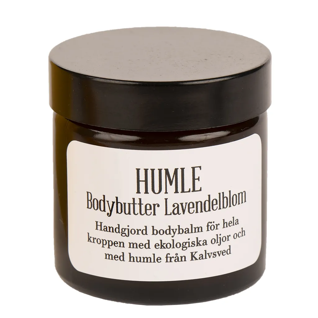 HUMLE Bodybutter Lavendelblom är ett näringsrikt bodybalm för hela kroppen, berikat med humleolja från egen gård. Den mjukgör och skyddar normal, torr och känslig hy samtidigt som den ger huden en naturlig lyster och intensiv återfuktning. Innehållande 98 % vispat, kallpressat ekologiskt sheasmör, mandelolja och kokosolja, ger det både återfettning och näring. De övriga ingredienserna består av E-vitamin, eteriska oljor och humleolja. Den fluffiga konsistensen absorberas snabbt och lämnar huden len och återfuktad, utan att kännas fet. Med sin friska och fruktiga doft av apelsin känns det lyxigt samtidigt som det är effektivt. Detta bodybutter är mycket drygt och passar perfekt för daglig användning. Doften är klassisk och rogivande, med lavendelns rena, blommiga toner.