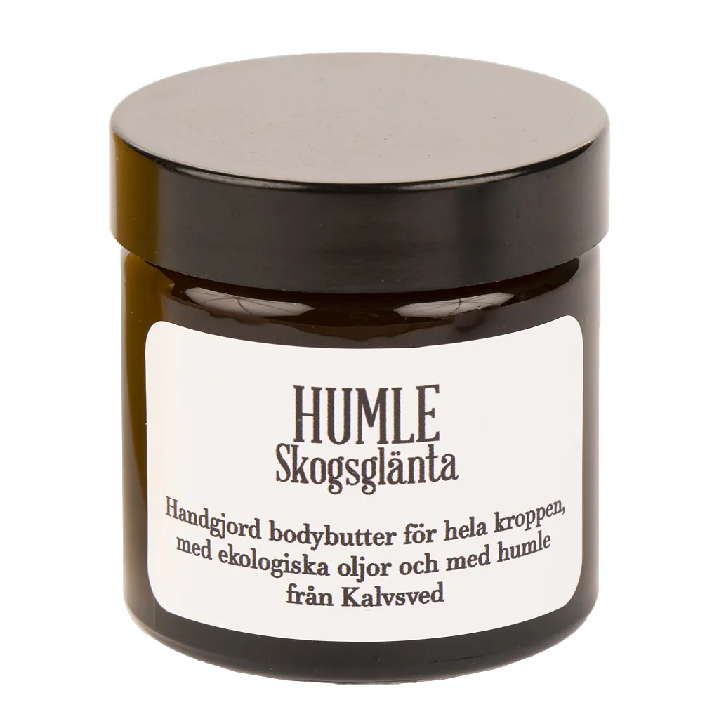HUMLE Bodybutter Skogsglänta är ett näringsrikt bodybalm för hela kroppen, berikat med humleolja från egen gård. Den mjukgör och skyddar normal, torr och känslig hy samtidigt som den ger huden en naturlig lyster och intensiv återfuktning. Innehållande 98 % vispat, kallpressat ekologiskt sheasmör, mandelolja och kokosolja, ger det både återfettning och näring. De övriga ingredienserna består av E-vitamin, eteriska oljor och humleolja. Den fluffiga konsistensen absorberas snabbt och lämnar huden len och återfuktad, utan att kännas fet. Med sin friska och fruktiga doft av apelsin känns det lyxigt samtidigt som det är effektivt. Detta bodybutter är mycket drygt och passar perfekt för daglig användning.