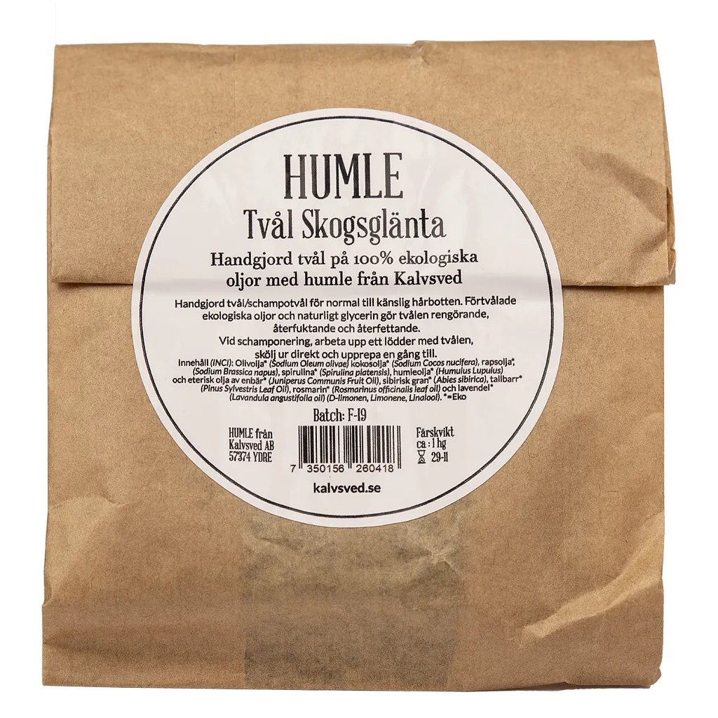 HUMLE Tvål Skogsglänta är en återfuktande och återfettande hand-, hår- och kroppstvål, berikad med humleolja från egen gård i Kalvsved. Denna handgjorda, fasta tvål är kokt på ekologisk olivolja, kokosolja och svensk kallpressad rapsolja. I förtvålningsprocessen bildas naturligt glycerin som binder fukt till det översta hudlagret, samtidigt som 3 % av oljorna inte är förtvålade och ger en lätt återfettning. Tvålen har en vacker grön färg, doftar friskt av skog och är förpackad i en fin papperspåse. Utsågs till ”Bästa rengöring 2022” av Stockholm Beauty Week.