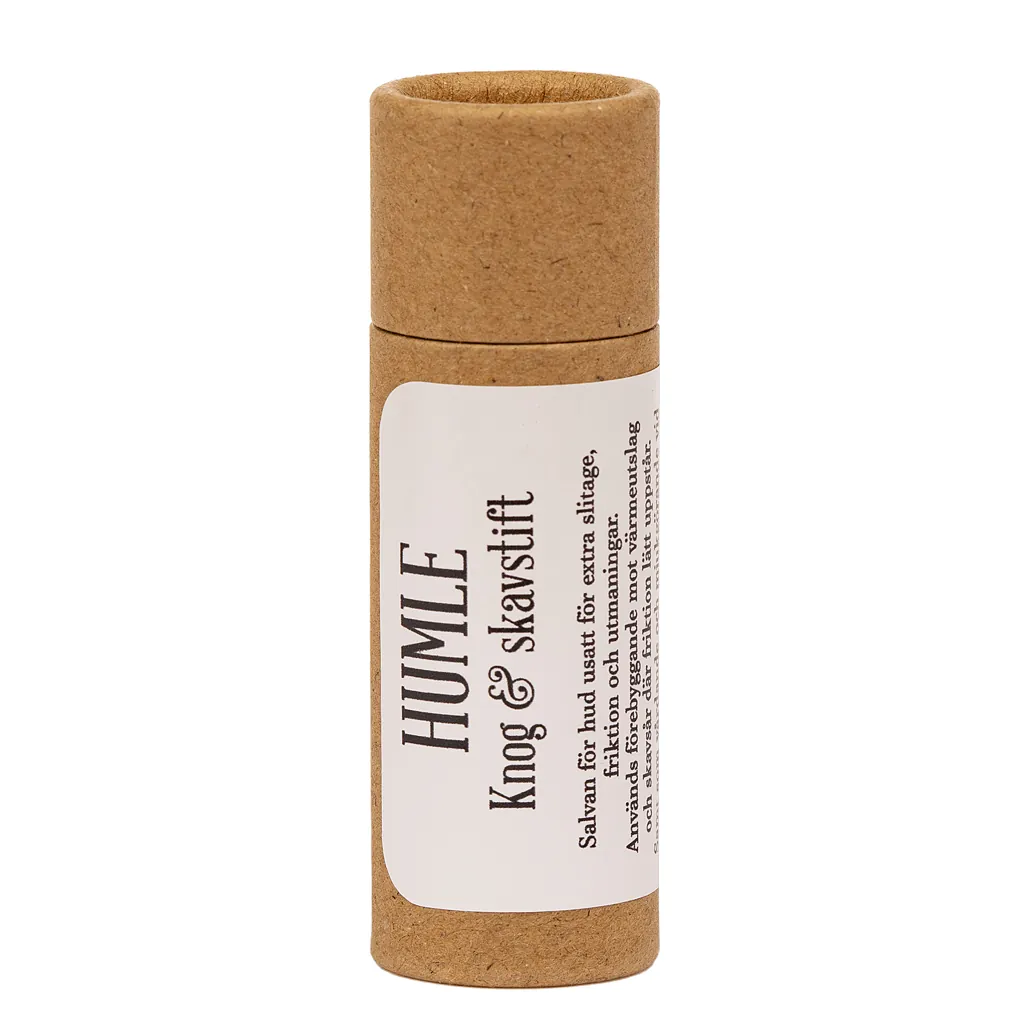 HUMLE Knog & Skavstift är ett extra skyddande och vårdande stift, en ekologisk salva, berikad med humleolja från egen gård i Kalvsved. Det passar perfekt för händer som arbetar hårt, slits av material och frekvent handtvätt. Det fungerar även bra att använda på torrsprickor, och känslig hud, samt som ett förebyggande skydd mot skavsår och ”lårskav”. Stiftet är kraftigt återfettande, lätt att applicera och absorberas snabbt in i huden.
