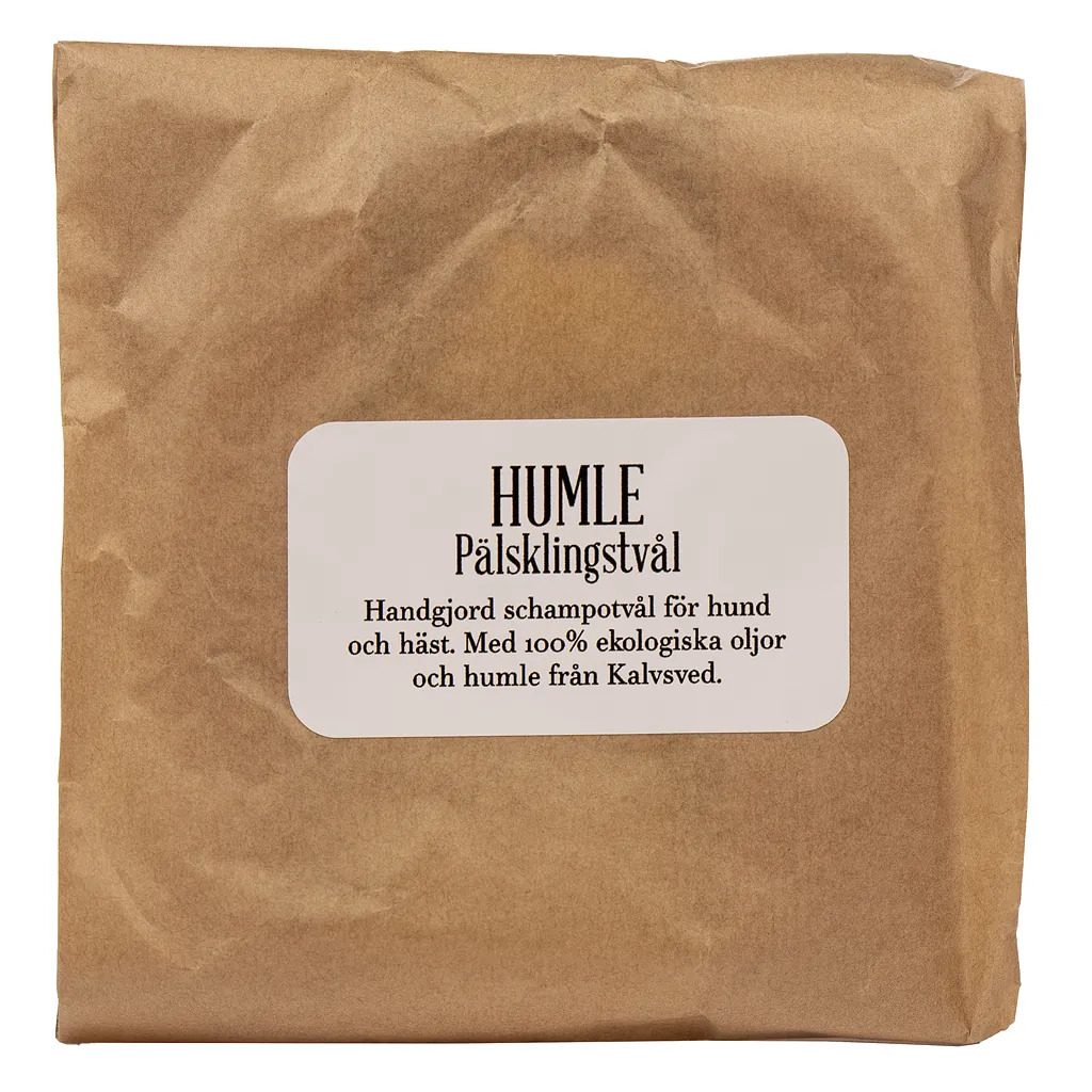 HUMLE Pälsklingstvål är en naturlig, lugnande hundschampotvål vid känslig och normal hud. Berikad med humleolja från egen gård i Kalvsved. Ett fast hundschampo gjort på förtvålade ekologiska oljor av oliv, kokos, raps, humle och de eteriska oljorna rosmarin och tea tree. För päls som smutsas ner av miljö och kroppsvätskor. Passar bepälsade djur med normal till känslig hy som på grund av allergier eller torrhet har lätt för att få hudbesvär. Tvålen har en behaglig, frisk doft och är förpackad i en fin papperspåse.