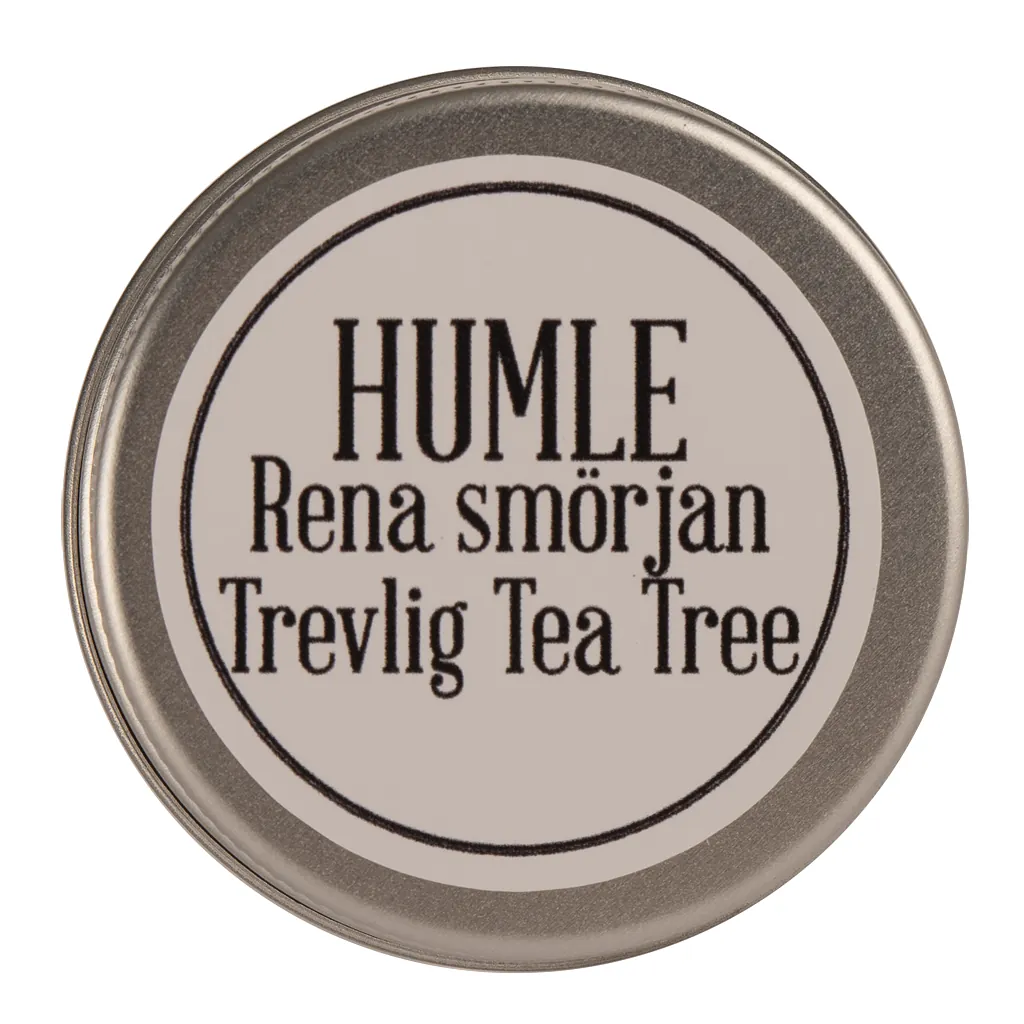 HUMLE Rena Smörjan Trevlig tea tree är en extra skyddande och vårdande ekologisk salva berikad med humleolja från egen gård i Kalvsved. Salvan är främst avsedd för riktigt torra och nariga händer och fötter, men går att använda på hela kroppen vid behov. Den innehåller ekologiska oljor som går djupt ner i hudlagret och ger en kraftig återfettning, utan att kännas kladdig. Den fungerar även bra som ett förebyggande skydd mot skavsår och ”lårskav”.