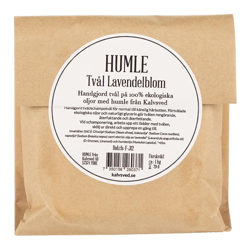 HUMLE Tvål Lavendel är en återfuktande och återfettande hud- och hårtvål, berikad med humleolja från egen gård. Tvålen har blivit mycket populär som schampotvål, särskilt bland personer med känslig hud eller torr och kliande hårbotten. Denna handgjorda fasta tvål är tillverkad av ekologisk olivolja, kokosolja och svensk kallpressad rapsolja. Under förtvålningsprocessen bildas naturligt glycerin som hjälper till att binda fukt i hudens översta lager. Dessutom är 3 % av oljorna oförtvålade, vilket bidrar till en skonsam återfettning. Doften är klassisk och rogivande, med lavendelns rena, blommiga toner. Tvålen har en vacker benvit färg.