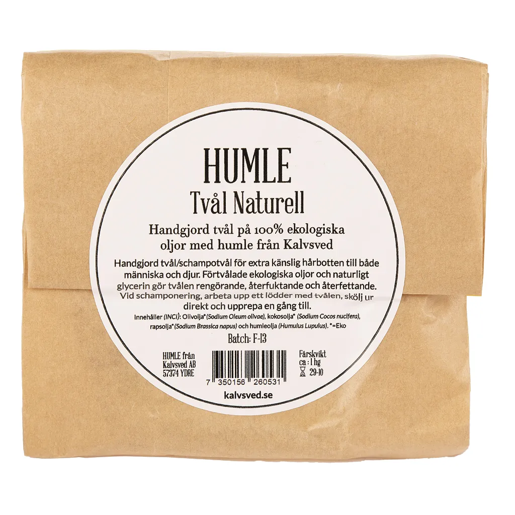 Humletvål Naturell -En tvål för rengöring av ansikte, kropp och som schampotvål utan parfym och tillsatt doft. En bra parfymfri tvål för känslig, reaktiv och torr hud. Följ gärna upp med vår ansiktsolja naturell, som är en ljuvlig olja istället för ansiktskräm vid känslig hy. Tvålen är kokt på ekologisk olivolja, kokosolja och svensk kallpressad rapsolja. I förtvålningsprocessen har naturligt glycerin bildats, och olja av gårdens egna humle bidrar med sina goda egenskaper. Den kommer i en papperspåse.