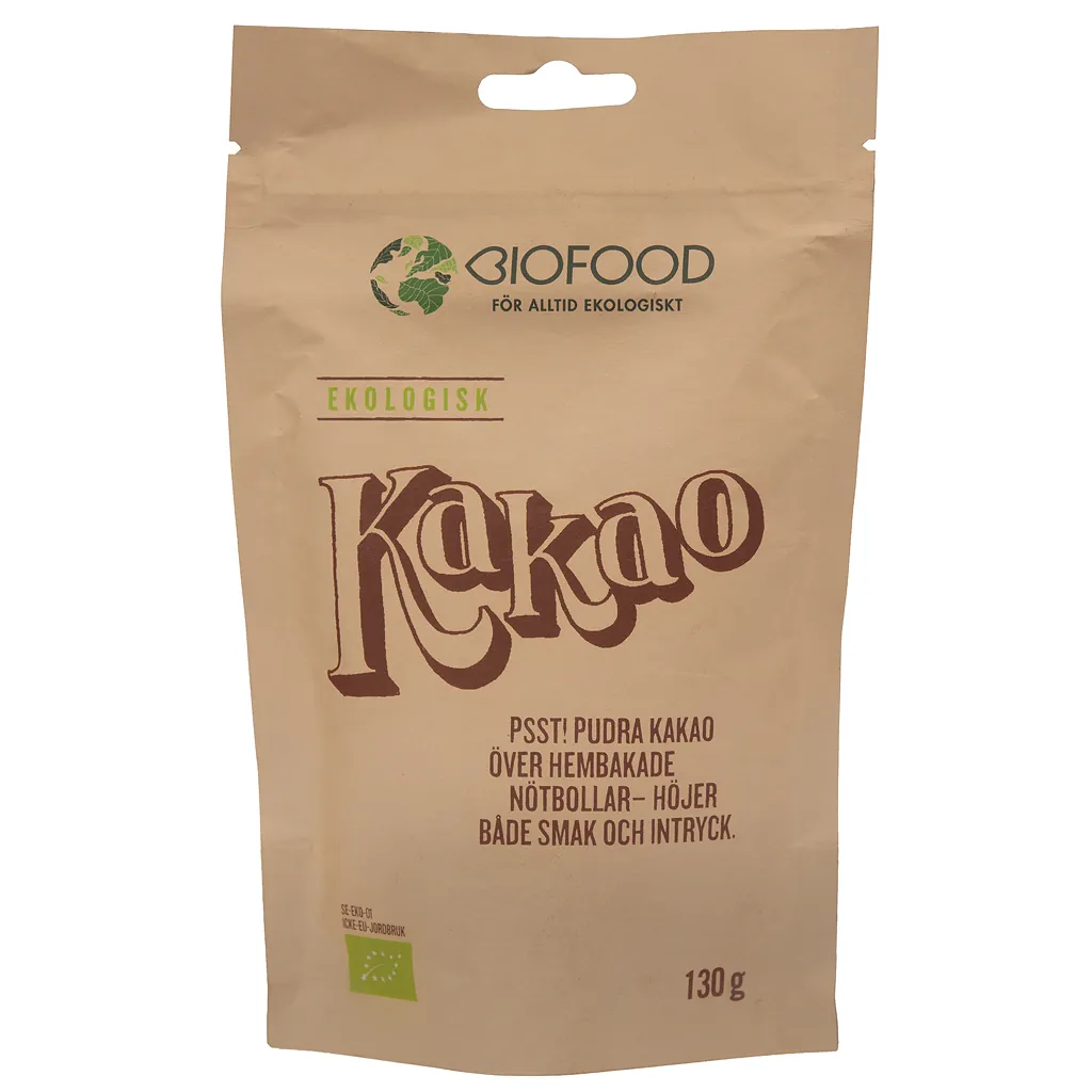 Biofoods ekologiska kakao tillverkas av kakaobönor som fermenteras, torkas, rostas och mals till ett fint pulver. Kakao är utsökt att använda till bakning, varm choklad och smoothies.