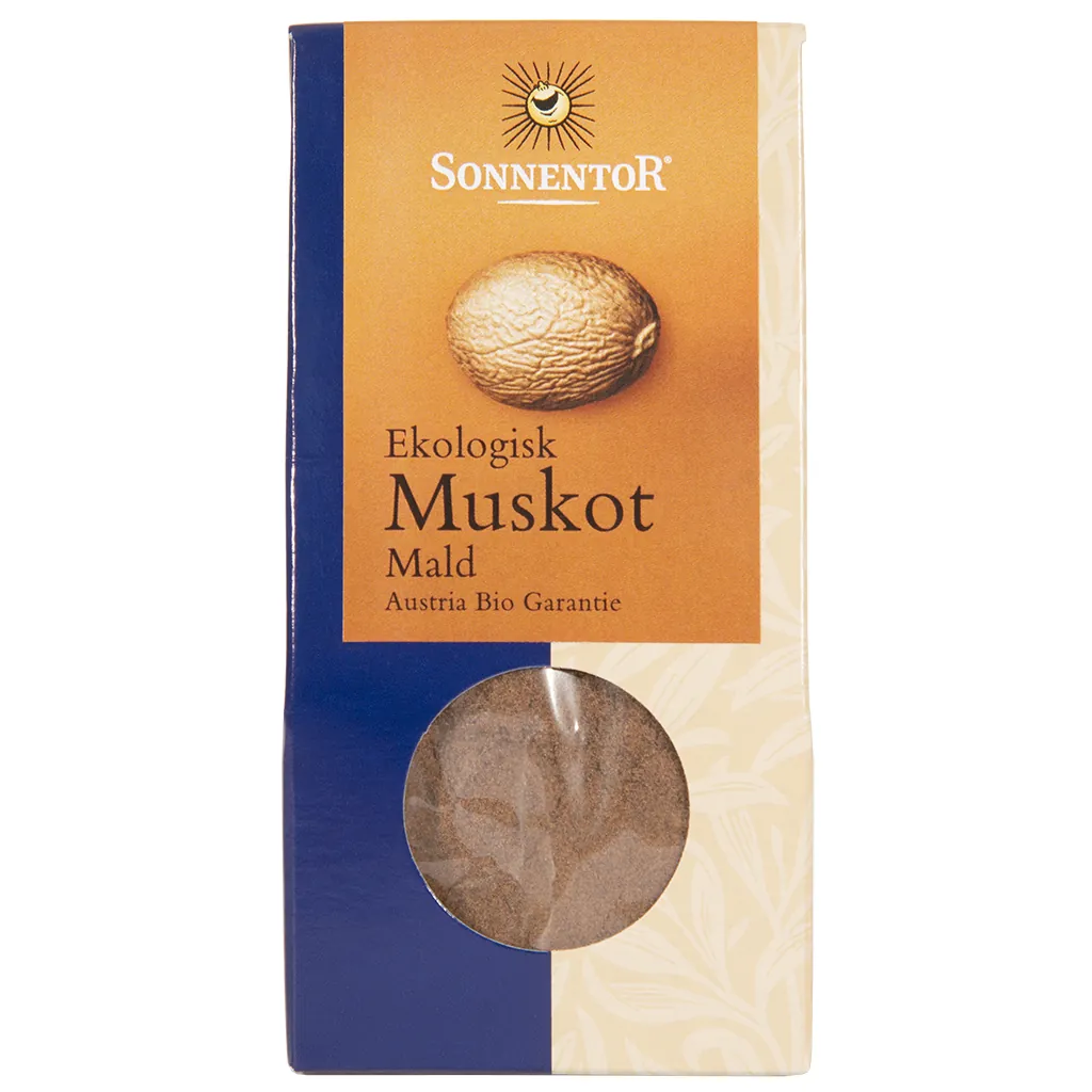 Sonnentors ekologiska och torkade muskotnöt ger extra djup smak till i stuvade makaroner, potatismos, stuvad potatis, stuvade grönsaker, béchamelsås, lasagne, spenat, ost- och äggrätter. Tänkt på att den nötiga smaken har en tendens att ta över så använd kryddan med måtta.