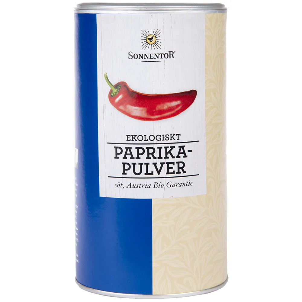 Ekologiskt paprikapulver att ha som smaksättare i all slags matlagning. Sonnentor grundades i Österrike 1988 av Johannes Gutmann vars affärsidé är att samla landsbygdens specialiteter som te och kryddor, sockerfri frukt och andra produkter – under ett varumärke som symboliseras av en ”leende sol”. Alla Sonnentors produkter är ekologiska, noga utvalda och av högsta kvalitet.