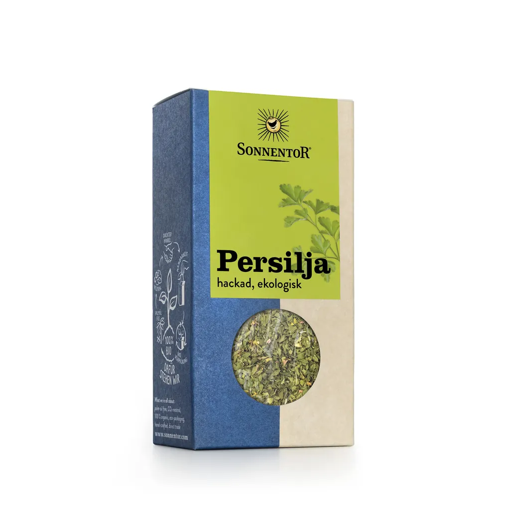 Sonnentors ekologiska och torkade persilja har en djupgrön färg och en intensiv smak av den gröna örten. Perfekt i matlagning eller strö på kvällsmackan.