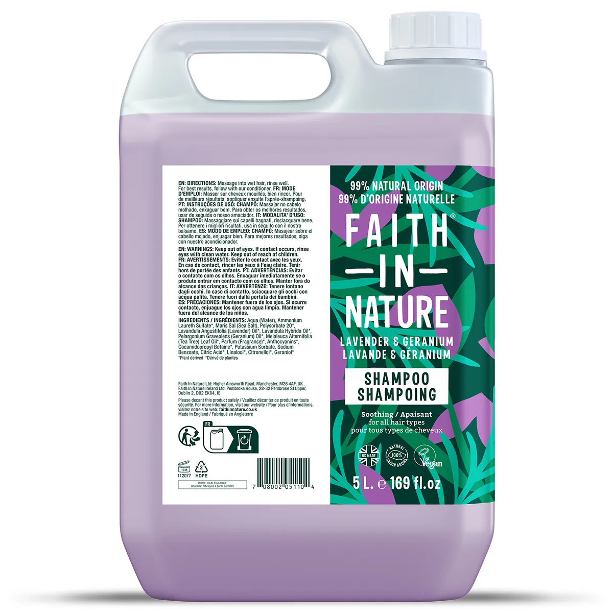 Äntligen finns det här schampot med lavendel och geranium från Faith in Nature i 5-liters förpackning! Ett schampo som har en ljuvlig doft av lavendel och geranium och ger en känsla av lugn. Passar alla hårtyper. Andas djupt och slappna av.