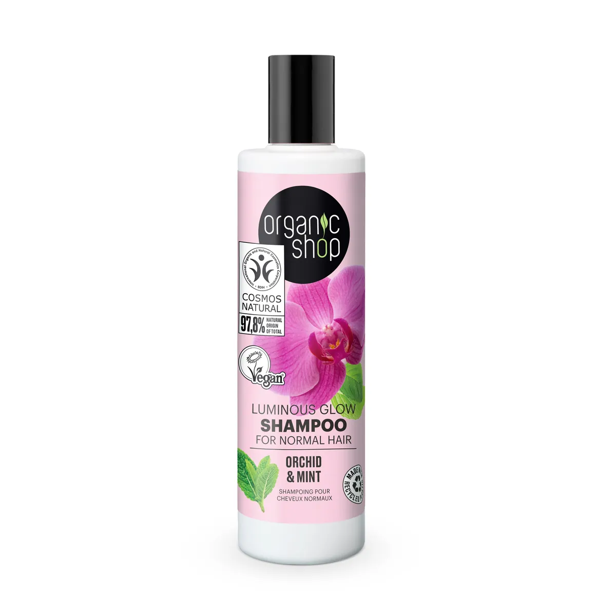 Organic Shops Schampo Orkidé & Mint är en harmonisk blandning av ekologiskt orkidéextrakt och ekologiskt pepparmyntaextrakt som har en uppfriskande doft som lyfter sinnet. Schampot rengör håret skonsamt, samtidigt som det tillför näring och ger det en vacker och hälsosam glans. Extra bra för normalt hår.