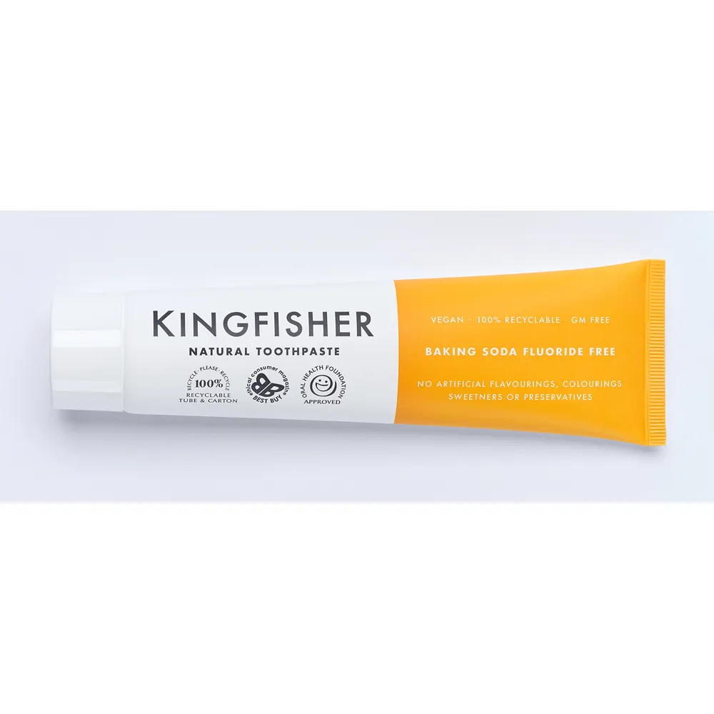 Kingfisher är en naturlig tandkräm som inte innehåller färgämnen, aromämnen, sötningsmedel eller konserveringsämnen. Kingfishers tandkrämer är ej testade på djur och innehåller inga animaliska produkter. Dessutom är de fria från genmodifierade råvaror och godkända av British Dental Health Foundation!