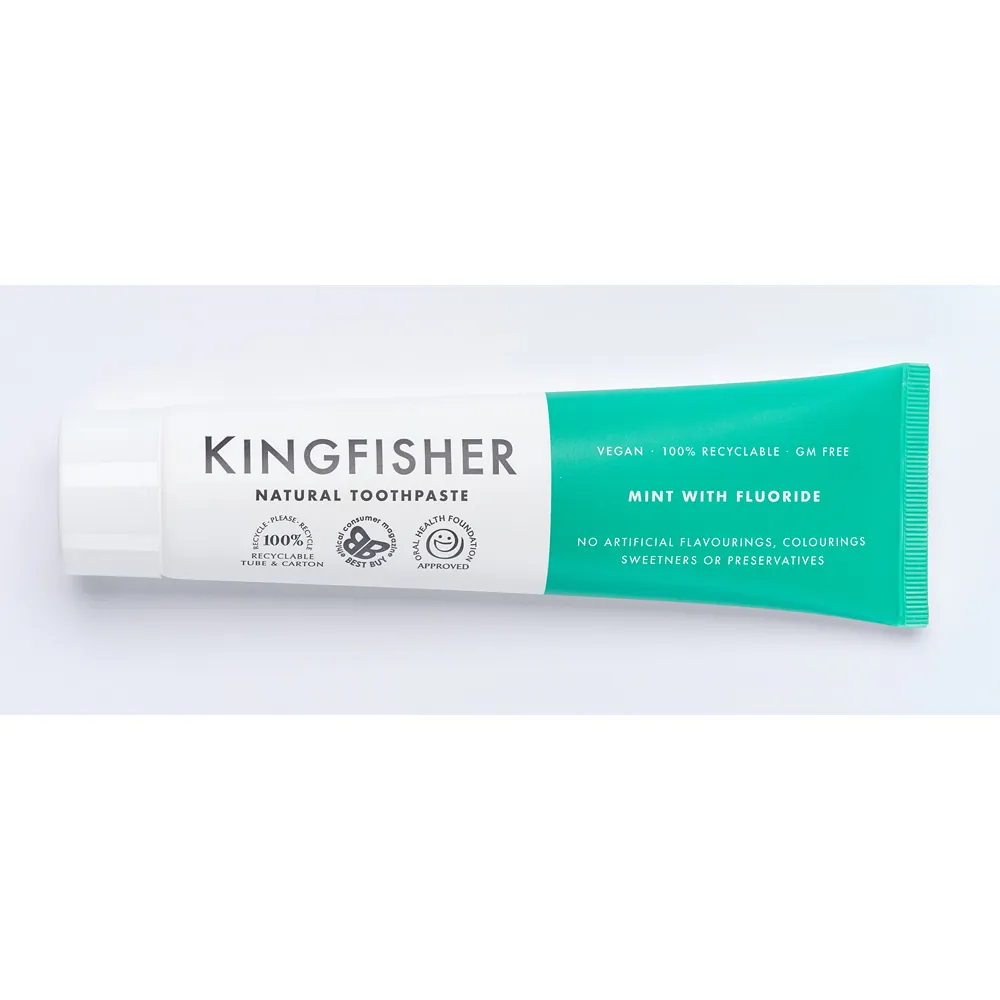 Kingfisher är en naturlig tandkräm som inte innehåller färgämnen, aromämnen, sötningsmedel eller konserveringsämnen. Kingfishers tandkrämer är ej testade på djur och innehåller inga animaliska produkter. Dessutom är de fria från genmodifierade råvaror och godkända av British Dental Health Foundation!