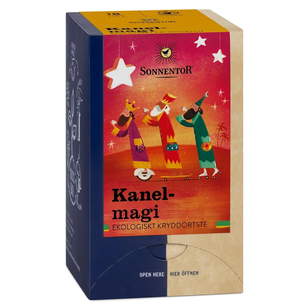 Sonnentors te Kanelmagi är ett kryddigt, fruktigt och värmande kanelte med inslag av citrongräs, björnbärsblad och citronskal. Perfekt till frukosten, för en paus mitt på dagen eller ihop med vintriga desserter. Magiskt gott!