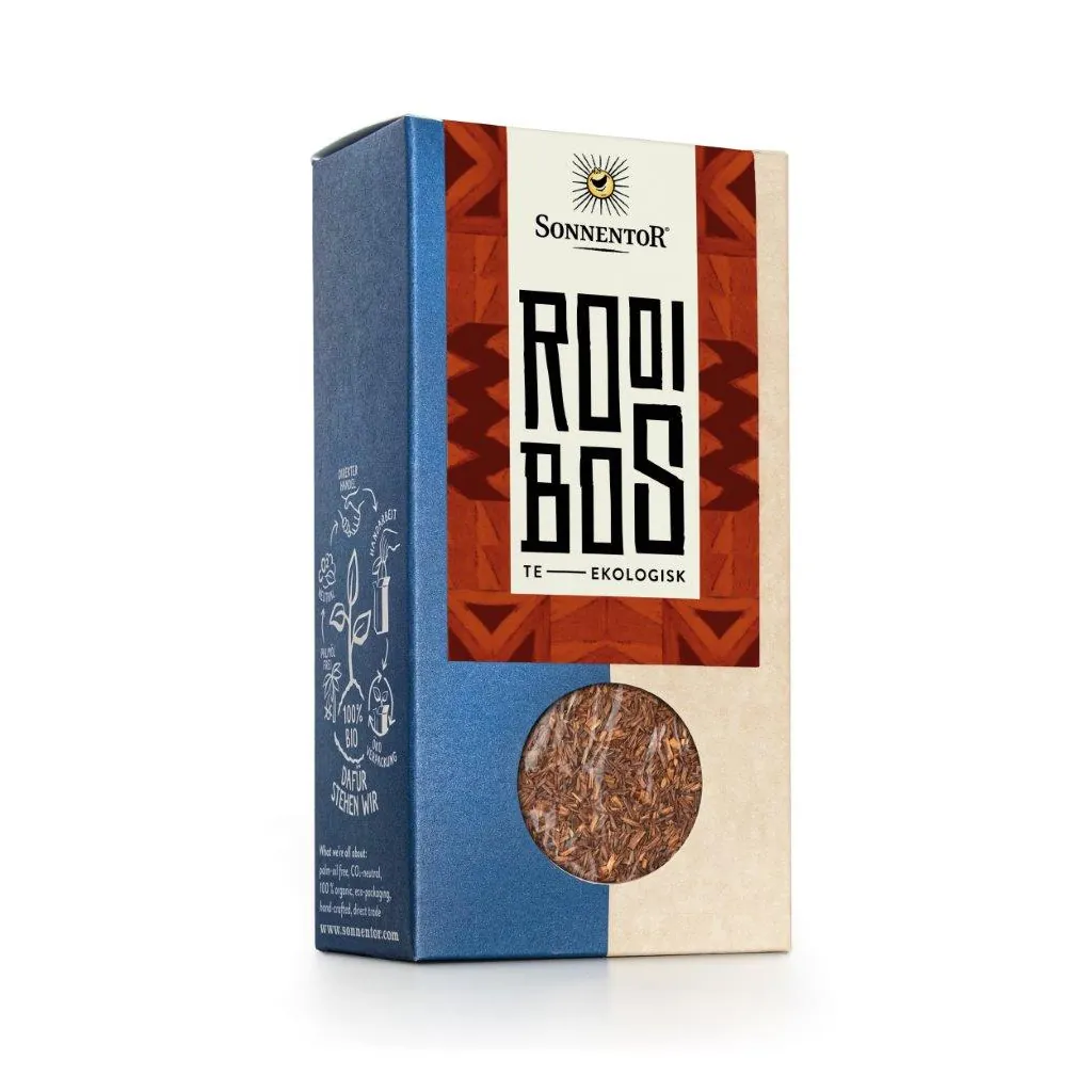 Sonnentors ekologiska rooibos te är ett rött te med en lite sötaktig och rökig smak som är typisk för rooibos. Innehåller inte koffein och kan med fördel drickas även på kvällen.