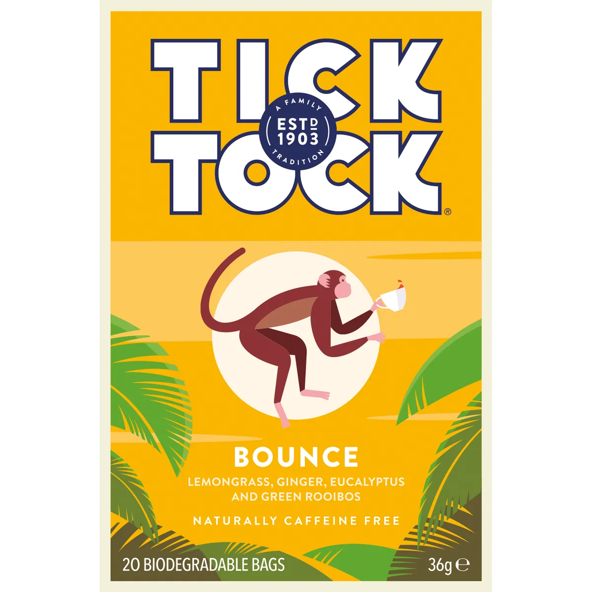 Tick Tock är en serie med populära och naturligt koffeinfria rooibos-teer som har avnjutits av te-drickare sedan 1903. Telådan har en ikonisk retro-design och innehåller 20 tepåsar som är klorfria, biologiskt nedbrytbara och komposterbara. Eftersom rooibos-te är naturlig koffeinfritt är det perfekt att njuta av när som helst under dagen.