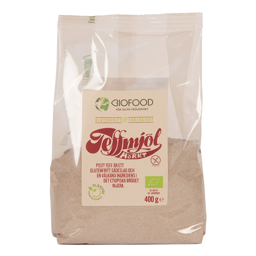 Teff är ett glutenfritt sädesslag som bland annat odlas i Etiopien, där mjölet är välkänt som ingrediens i brödet Injera. I Biofood’s glutenfria serie finns förutom teffmjöl även rårismjöl, bovetemjöl, majsmjöl och quinoamjöl, som ger fyllig smak och näring till dina favoritrecept. Tips! Mjölerna är goda att blanda, kombinera olika sorter och skapa din egna glutenfria mjölblandning.
