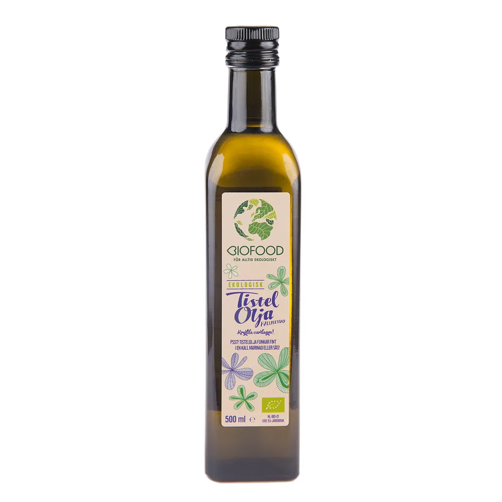 Ekologisk tistelolja är en torr olja som har många användningsområden. Den innehåller en stor mängd linolsyra (omega-6) och passar bra för fet hud. Tistelolja har en nötaktig god smak – ringla över en krispig sallad eller använd till annan matlagning. Eller varför inte använda den som massageolja? Förvaras svalt (<20 C) och torrt.