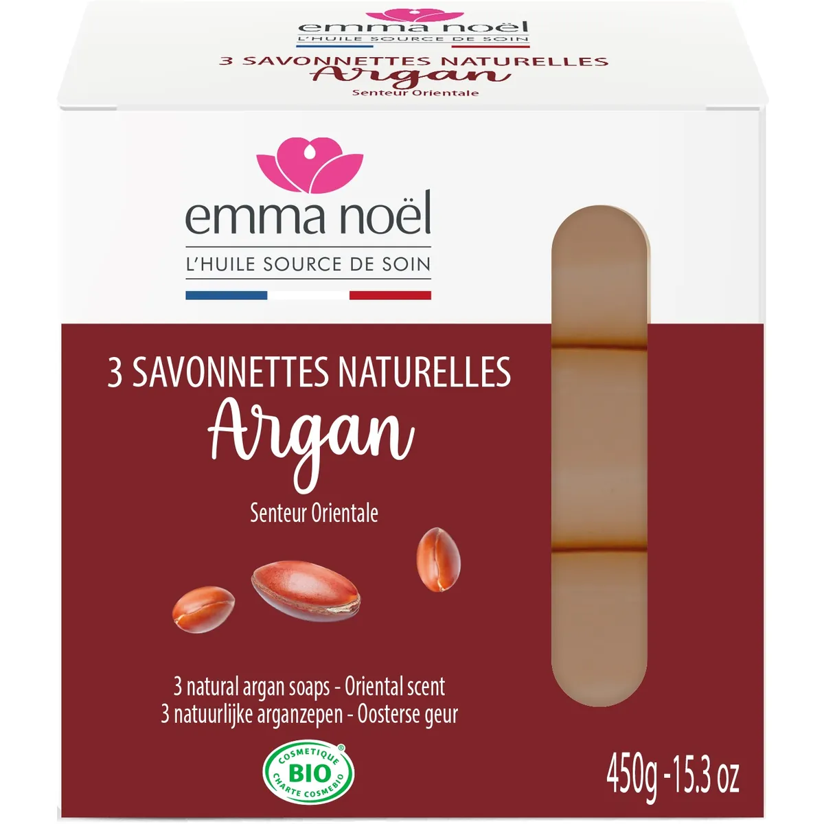 Emma Noëls fasta tvålar med arganolja i 3-pack har en bra konsistens, fasthet och löddrande förmåga. De är framställda av 99 % naturliga ingredienser samt ekologiska oljor och extrakt, vilket ger tvålarna en fräsch doft. Tvålarna är helt fria från artificiella färgämnen och är ej testade på djur.