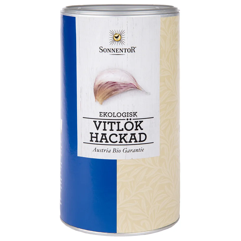 Ekologisk hackad vitlök att ha som smaksättare i all slags matlagning. Sonnentor grundades i Österrike 1988 av Johannes Gutmann vars affärsidé är att samla landsbygdens specialiteter som te och kryddor, sockerfri frukt och andra produkter – under ett varumärke som symboliseras av en ”leende sol”. Alla Sonnentors produkter är ekologiska, noga utvalda och av högsta kvalitet.